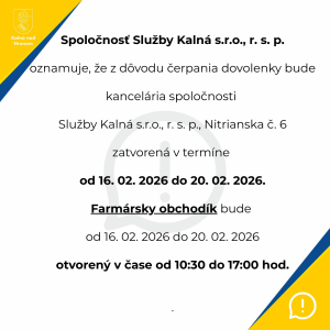 Spoločnosť Služby Kalná s.r.o., r. s. p. oznamuje, že z dôvodu čerpania dovolenky bude kancelária spoločnosti Služby Kalná, Nitrianska č. 6 zatvorená v termíne od 16.02.2026 do 20.02.2026.